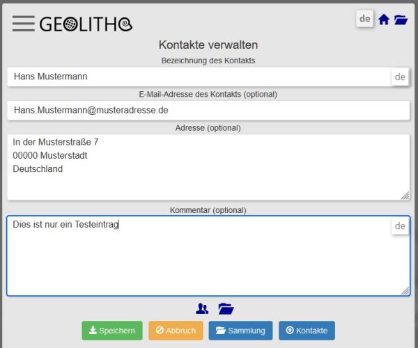 Per assegnare persone a eventi di qualsiasi tipo, ad esempio come scopritore, analista, donatore, ecc., è disponibile la gestione dei contatti. Qui potete creare contatti e, se necessario, assegnare anche documenti al contatto. È possibile memorizzare, ad esempio, una foto della persona o una scheda del collezionista in formato .jpg e .pdf.