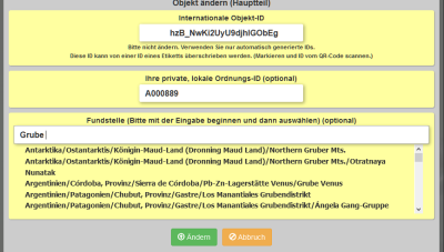 An input mask will appear in which the International Collection Number has already been filled in. Do not change this number. Unless you want to create an object that already has a 22-digit international number. In this case you can overwrite the number. A number may be used only once in a collection. To keep the uniqueness, please do not invent your own numbers.