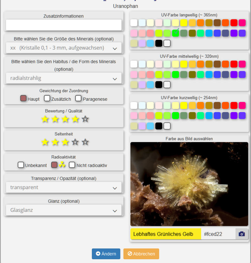 The assignment still appears somewhat sparse. Special properties of the minerals are missing. There is neither a size specification nor information about habit, quality, color, etc. of the individual minerals. To change this, a button for editing can be clicked behind each mineral and the properties can be completed.