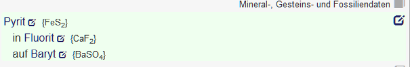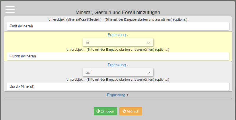 A pyrite embedded in fluorite on a baryte matrix can be assigned to the collection object using so-called connectors such as in, on, next to, etc. Chains of these connectors can be assigned. This can also be represented for a pyrite in shale or an ammonite in lithographic limestone.